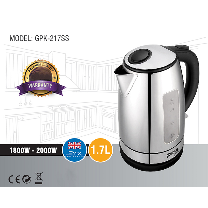 Ấm Siêu Tốc Goldsun GPK217SS kế tiện dụng, tay cầm cách nhiệt tiện di chuyển, thang đo thể hiện mực nước bên ngoài bình thuận tiện quan sát.