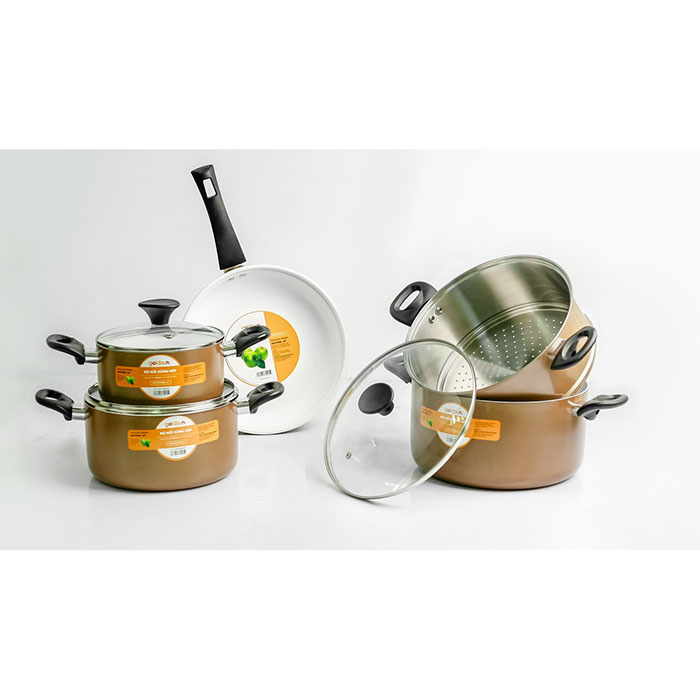 Bộ nồi nhôm AE14-5208AG-IH bao gồm 3 nồi, 1 xửng hấp và 1 chảo chống dính với mẫu mã thời trang đẹp mắt, giá cả hợp lý và chất lượng đã được kiểm định, sẽ là 1 combo phù hợp với mọi gian bếp.
