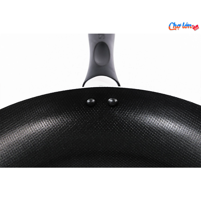 Tay cầm: Tay cầm được bắt vít chắc chắn vào thân chảo, đảm bảo an toàn trong quá trình sử dụng, nâng nhấc, di chuyển. Cán cầm bằng nhựa chịu nhiệt siêu bền có độ dài vừa phải, chống bỏng, hạn chế trơn trượt.