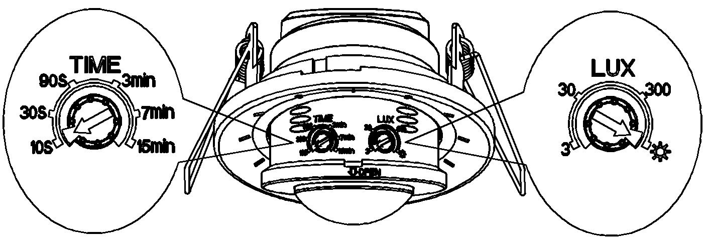 Nút TIME: Điều chỉnh thời gian tự tắt,trong khoảng thời gian có thể chỉnh tự tắt từ 10 giây đến 10 phút.Thời gian trễ này sẽ được bắt đầu tính lại trong chu kỳ cảm ứng mới