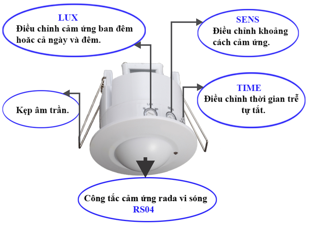 Nút SENS: Điều chỉnh khoảng cách phát radar để nhận chuyển động.khoảng cách chỉnh tối thiểu 2m“Dấu - “ khoảng cách chỉnh tối đa 12m“Dấu + “