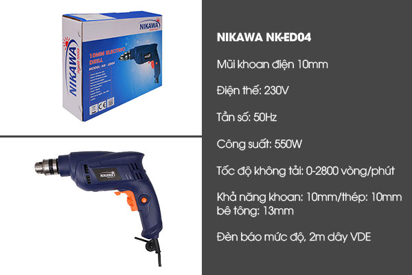 Máy khoan cầm tay Nikawa NK-ED04 với thiết kế bắt mắt, kiểu dáng mạnh mẽ. Sản phẩm đạt chất lượng tiêu chuẩn Châu Âu và tiêu chuẩn sản phẩm an toàn tại thị trường Đức – một trong những tiêu chuẩn khắt khe nhất hiện nay.