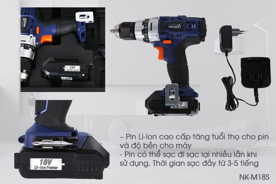 Máy khoan không dây Nikawa NK-M18S có thiết kế màu xanh cam đảm bảo vệ sinh, và dễ che đi chất bẩn khó chùi tạo độ mới cho sản phẩm. Thiết kế ngắn phù hợp tay cầm tiện lợi sử dụng lý tưởng cho các công việc trên không và nơi chật hẹp. Máy có tích hợp thêm đèn Led chiếu sáng cho khu vực làm việc, thậm chí ở những nơi thiếu ánh sáng. Máy khoan pin cầm tay Nikawa NK-M18S sử dụng pin Li-ion với công nghệ bảo vệ pin – dòng pin chuyên sử dụng cho các smartphone hiện nay. Pin có khả năng tản nhiệt tốt, làm mát máy ngay cả khi vận hành liên tục giúp tăng tuổi thọ cho máy.