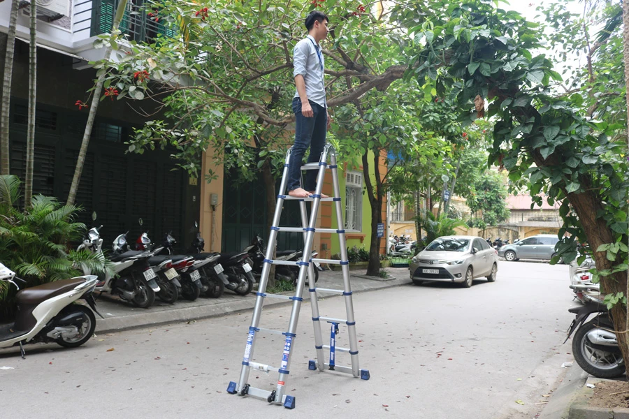 Ngoài ra, khi cần làm việc tại các khu vực không bằng phẳng như bậc thang chẳng hạn. Bạn hoàn toàn có thể điều chỉnh độ cao chân thang hai bên không tương đồng để phù hợp với địa hình.